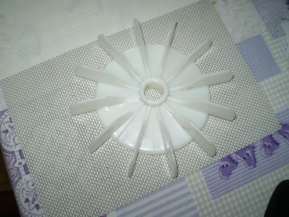 kolo prasklo , osazení na vybrání na hřídeli se odřelo , kolo se na hřídeli se volně točí, plast je již degradovaný plný drobných trhlinek. Bez větrání po cca 15 min. se už motor přehřívá .