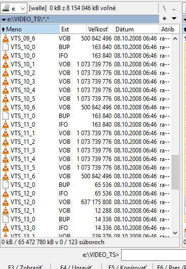 Na prvom DVD je 65GB súborov, na druhom 44GB. Ak do VLC hodím celý adresár, tak prehrá len menu s výberom jazyka. Na jednotlivé súbory hlási, že sú nečitateľné. Nečítateľné sú aj v Total Commanderi.