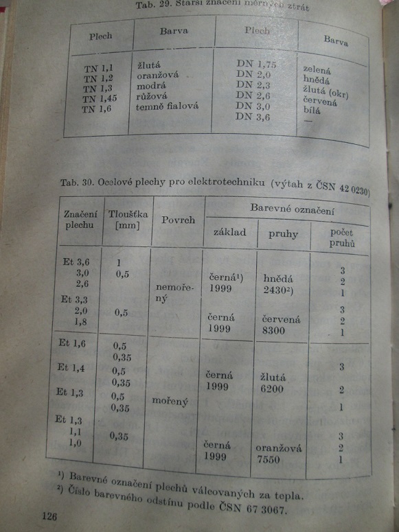 Díky, už jsem to našel. V druhé tabulce je nové značení - plechy Et - válcované za tepla. Barevné značení na plechách s tou tabulkou moc nekoresponduje. Ještě jsem našel plechy EI40 z výstupního trafa AUJ620, ty nemají žádnou barvu, jsou z obou stran stejné, tedy budou oboustranně oxidované. Ten hnědý je z výstupáku AUJ637, též oboustranně oxidovaný. Tyto hnědé plechy se vyskytovaly často v síťových trafech.