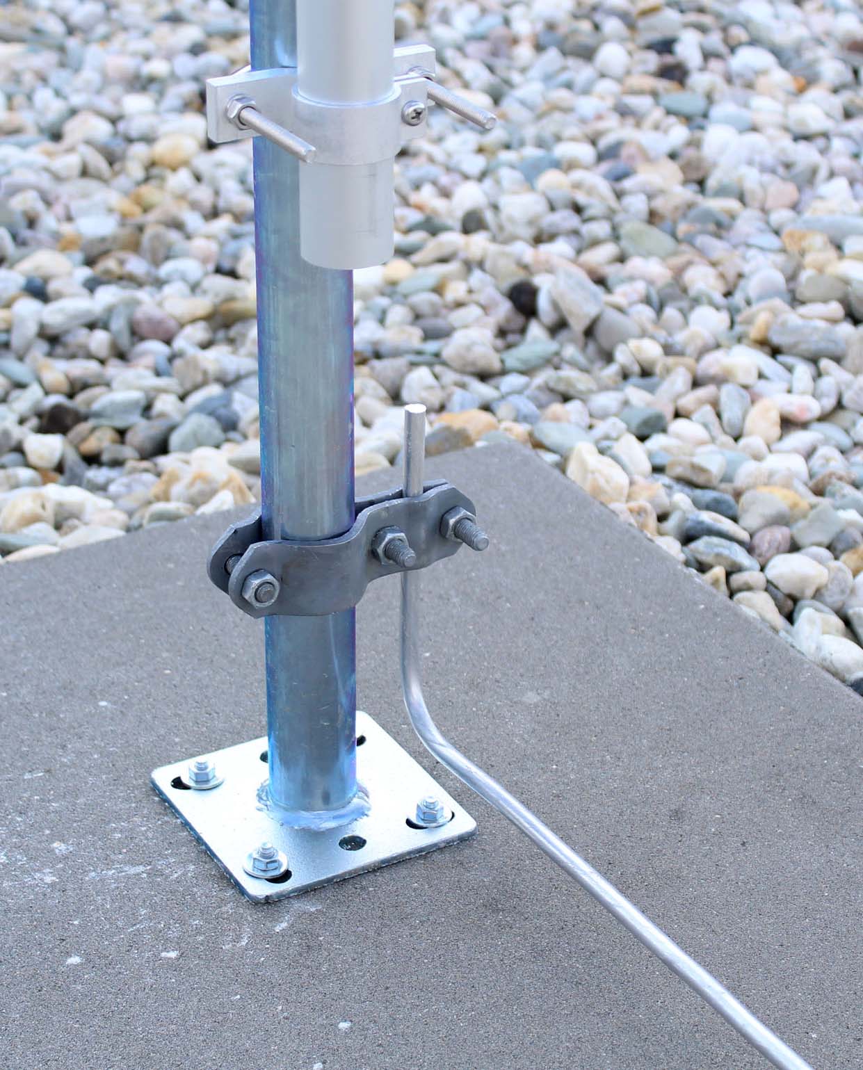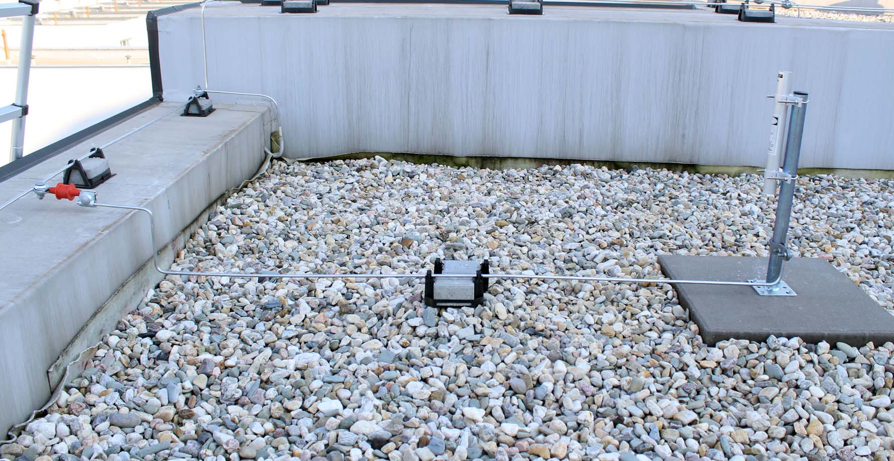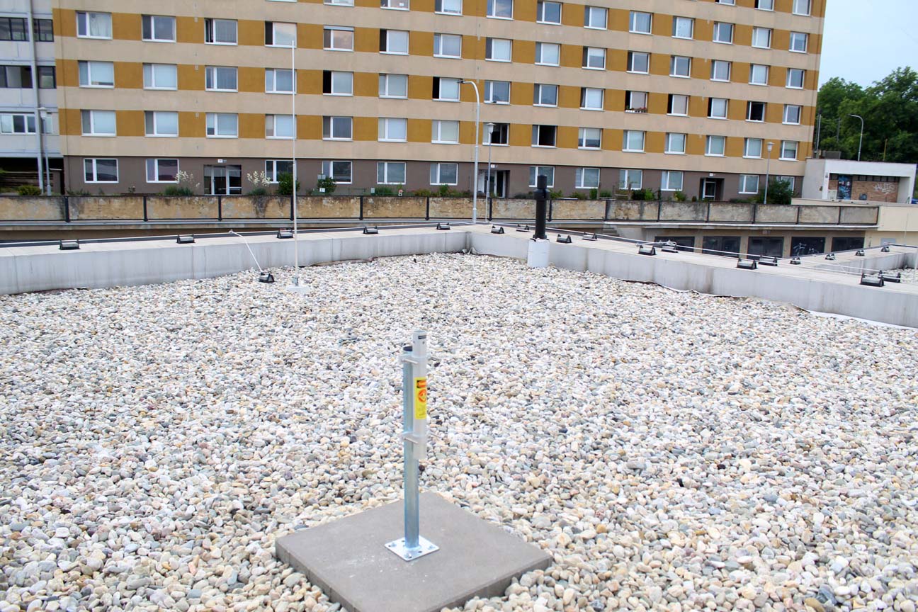Konzole je uchycená ve dvou betonových kachlích 500x500x50, každá váží 27 kg. Podložený jsou 25 mm gumou, ale to je spíš pro ochranu střechy. Prošroubovaný čtyřma kotvama, tak toto je doufám dostatečná váha, aby to neshodil vítr.