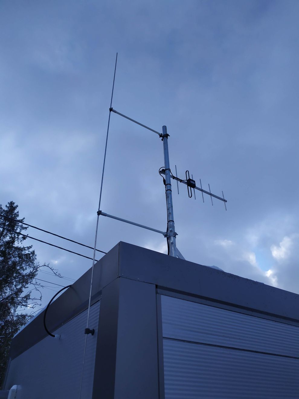 Je zajímavé, že technikovi nevadila trubka s křížovou anténou na 2 m, dualquadem na 70 cm a pětiprvkovým dipólem na 50 MHz na rotátoru na hřebenu střechy. Na trubce přivařené oko a připojení na existující hromosvodovou soustavu jen s krátkými jímači na obou koncích hřebenu střechy. Prohlásil, že se tím stala nosná trubka a celý systém antén nepravým jímačem a vzledem k rozměru antén mi jen "důrazně doporučil" odpojovat všechny antény u zařízení a rozhodně je v hamshacku o 15 m níž neuzemňovat. I jemu se zdálo stavění 8,5 metrového jímače k pokrytí celé soustavy nereálné.