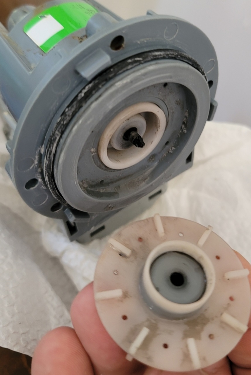 Takze, pracka zacala vypisovat 5E chybu, vynikajici, normalne vypousti vodu, vse OK a pak pri suseni 5E. Jelikoz jsem nic spatneho nenasel, pracku jsem demontoval na casti a poctive zkousel mozne I nemozne. Ma to dve cerpadla, no a jedno vypada takto, videl jsem je spalene, zamotane chuchvalci vlasu, ale zlomenou hridelku...