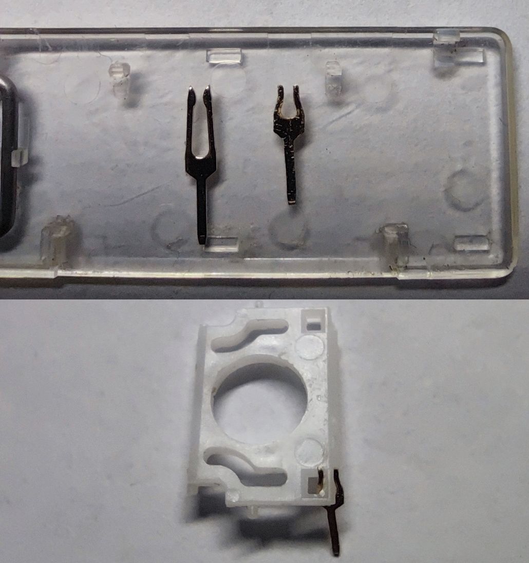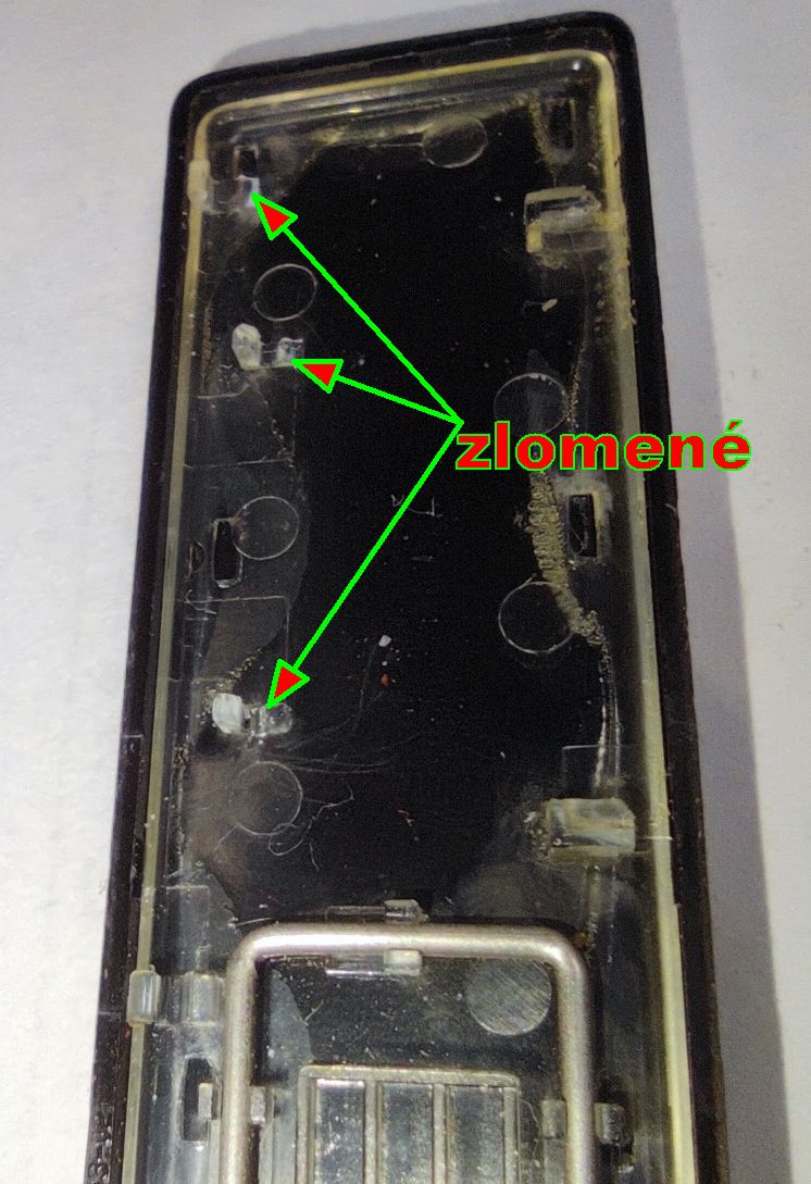 Transparentní část šla vytáhnout, protože byla přilepená na oboustranné pásce. Tu packu nahradím celou s tím, že tam vyvrtám dírku a upevním tam nové packy, udělané z řadového konektoru, což by mohlo stačit. Ta umělá hmota bude trpět vůči tomu kovu, ale pokud se to příště rozpadne, tak už to tolik nebude mrzet.