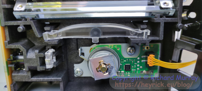 Nad otáčkami zrkadla som uvažoval, ale ručne sa točilo ľahko a malo zotrvačnosť, tak som to radšej neriešil, rozobrať to zas nieje také jednoduché. Predpokladám funkciu podobnú ako mali staré laserové tlačiarne, teda laser svietil na rotačné zrkadlo, a na jednom konci dráhy je fotodióda ktorá ho sníma (pokiaľ nieje integrovaná v laseri). A teraz neviem či to kontroluje práve frekvenciu na tejto dióde, alebo odozvu z motora. Všetko je tam hrozne mrňavé a neprístupné.