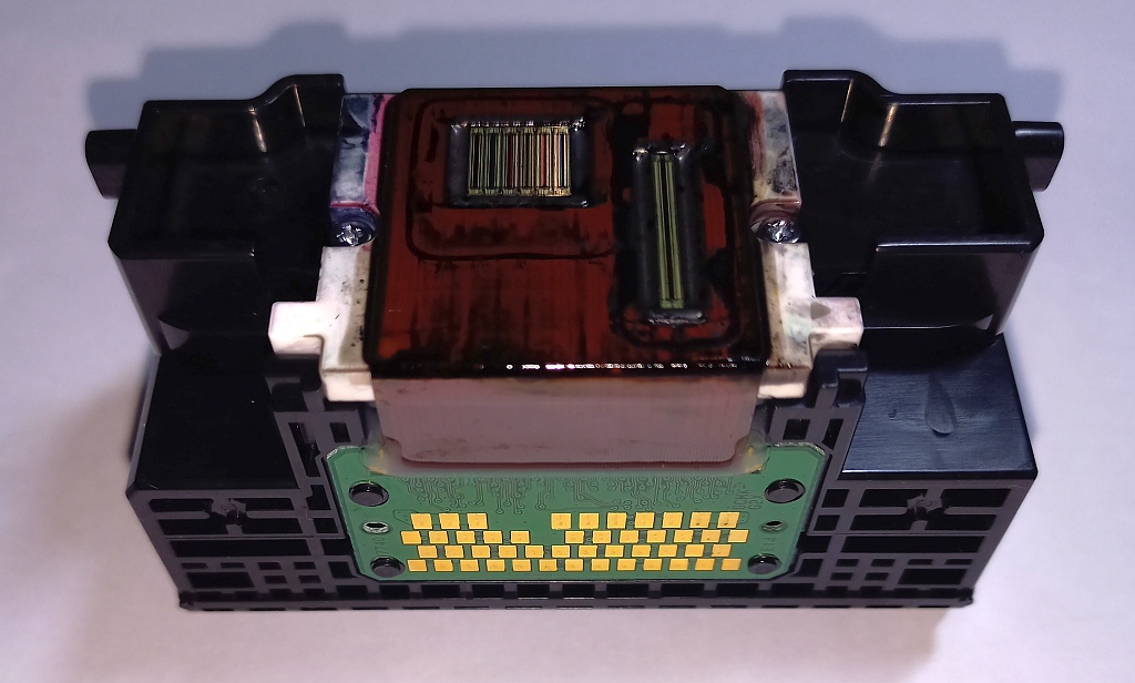 Hlavu jsem proplachoval nakapáváním destilky na plochu kam dosedá cartridge a kde dochází k přenosu inkoustu a ze spodu kde jsou trysky jsem měl savé papírové kapesníčky. Zkusil jsem dále taky celou hlavu ponořit do vlažné destilky na asi 15 min.