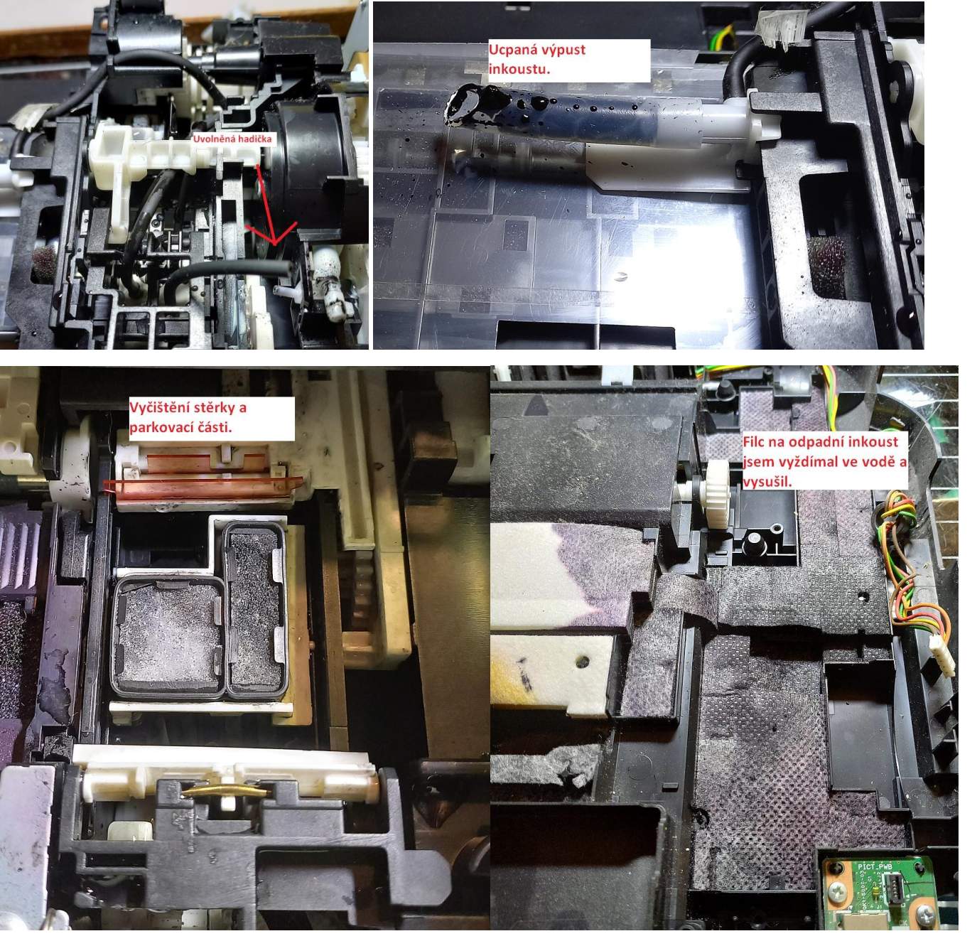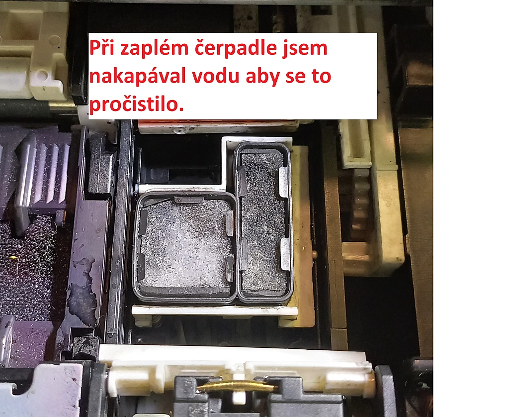 Při zapnutí tiskárny a inicializaci se na několik vteřin spustí čerpadlo a v tu chvíli jsem kapal vodu do odkapávající časti kam parkuje hlava, aby se to pročistilo. Opakoval jsem to několikrát.