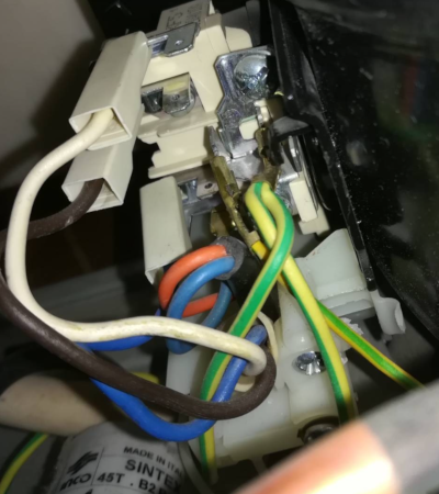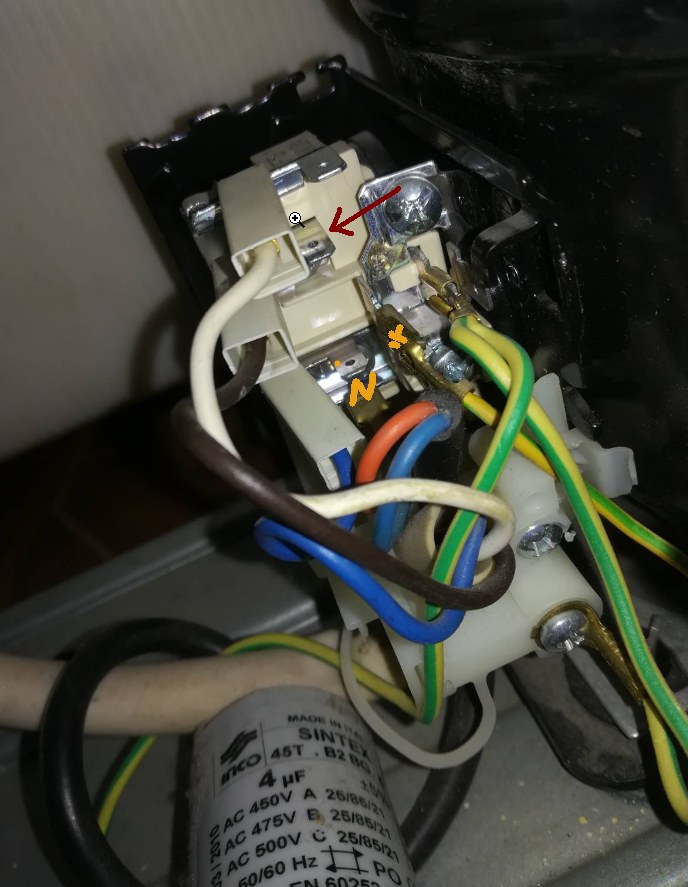 Nulák předpokládám k nulákům mírně vlevo dole pod osazený faston (překrytý modrým a oranžový drátem). Kam ale patří fáze? Na úroveň hnědého vodiče, či na úroveň bílého vodiče.