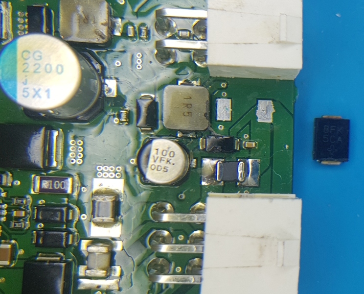 Pekný deň. Možno blbosť, alebo možno niekomu táto info ušetrí čas a peniaze. Už tu mám pokazenú druhú nabíjačku pre robotickú kosačku Husqvarnu Automower a obidve mali rovnakú príčinu poruchy - prerazená (v skrate) ochranná dióda SMCJ30A paralelne pripojená k napájaniu označená BFK.