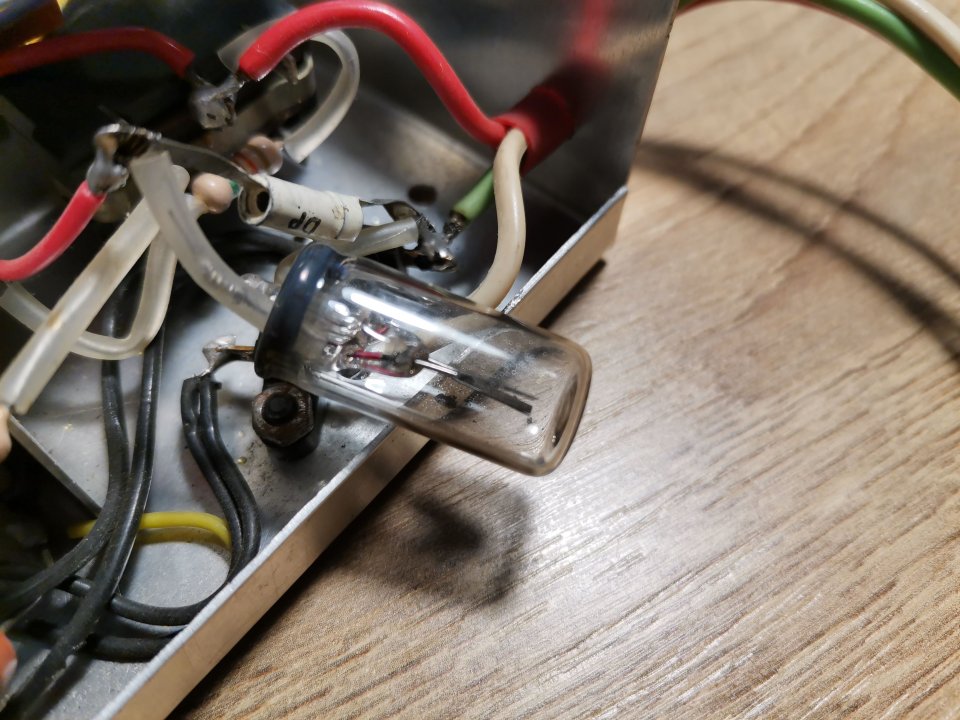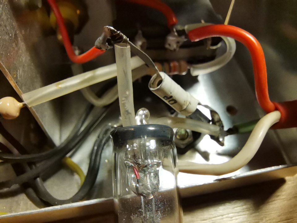 ten asi původně startér je zapojen tedy tak, že mezi jeho vývody je paralelně "něco", nelze naměřit žádný odpor, z vývodu jde na kontakt s potenciometrem, z toho pak na další "cosi" (sledujte červený vodič), opět nelze naměřit odpor, a to vše pak přes odpor 6,7K na G3 elektronky 6F32