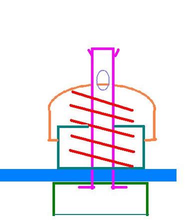 Pokusil jsem se neuměle nakreslit svorku ze stavebnice. To fialové je trubička dole a nahoře rozehnutá s průchozí dírkou kam se strkají drátky. Dole je kalíšek co se strká do děr v základní desce, nahoře jsou dva kalíšky, mezi nimi je pružina. Horní kalíšek se stlačí, do dírky se strčí drátek a silou pružiny drží. Tedy mělo by to takhle fungovat. Ale protože to bylo vyrobené z konzervového plechu, tak to moc nefungovalo.
