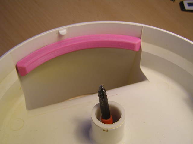 Víc než 20let mě …...konstrukční chyba struhadla BoschMUM. Řezací kotouč není ze strany vejfuku téměř 180stupnů podložen a vlivem jeho prohnutí a kmitání dochází k propadání větších kusů strouhanky nebo ořechů do nastrouhaného materiálu. Manželka musí strouhanku prohnat znova přes síto, práce navíc a min ¼ se vyhodí. Vložil jsem pod strouhací kotouč šajbu ,viz obrázek), která ho udrží ve figuře a je po problému. Byla trochu honička podložku nakreslit pro 3D tisk. Všechno je v úhlu a nedokázal jsem změřit zadávací hodnoty. Systémem pokus/omyl jsem se dopracoval k přijatelnému výsledku. Dosedací plochy je třeba doladit trochu pilníkem na průhled. Tvar je nutné zachovat aby se protáčely všechny možné kotouče. PLA není úplně nejlepší materiál ale vzhledem k tomu, že struhadlo běží tak 2x za měsíc 5min, tak asi problém v tomto nebude, zvláště,když plochu lehce postraším sádlem. Také tlak kotouče na podložku při takovéto ploše bude minimální a odírat se to nebude. Podložku jsem podlepil alcaprenem + 3x anticoro vruty 2,7x10. To neupadne.