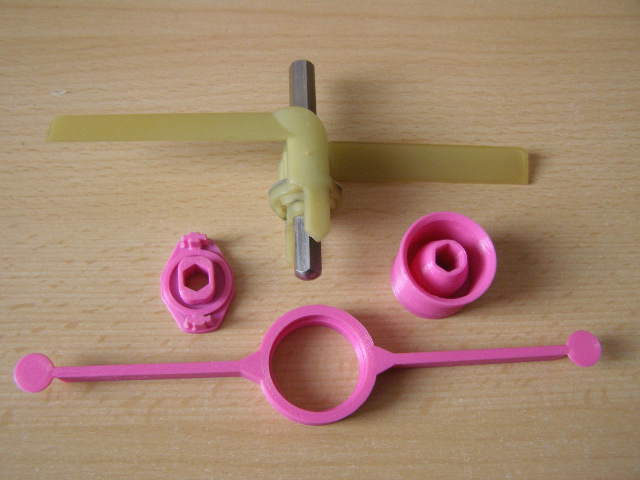 Po roce používání se vrtule naražená na unašeči s šestihranem „vyležela“ a měla občas tendenci vybíhat nahoru o 1mm. Blbě to vyhazovalo. Zalepil jsem to k sobě vteřiňákem. Přemaloval jsem zaklapnutí obou dílů do sebe a sadu vytisknul. Upravená varianta je na obr. Část, která zapadá do řezací plotny je bez úpravy. Na tisk je třeba asi 10m PLA drátu a trochu zahladit diamantovým pilníkem.