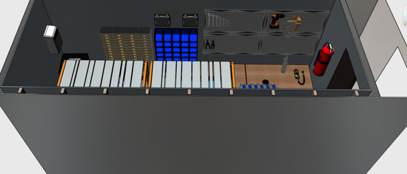 Na obrázkoch nižšie je model spomínanej dielne. Vonkajšiu konštrukciu bude tvoriť plech 0,55mm pozink potom drevený rám hliníková izolačná fólia, samozrejme všetky spoje budú prelepené hliníkovou páskou a na to pôjde bukas. Skrutky budú opäť prelepene gumovou izolačnou páskou. Vonkajšia vrstva by bola uzemnená a vnútorná tvorená hliníkovou fóliou by bola neuzemnená / plávajúca. Súčasťou je aj predkomora, ktorá zabezpečí že vždy budú aspoň jedny dvere zatvorené a elektronika tak nikdy nebude exponovaná okolitým vplyvom.