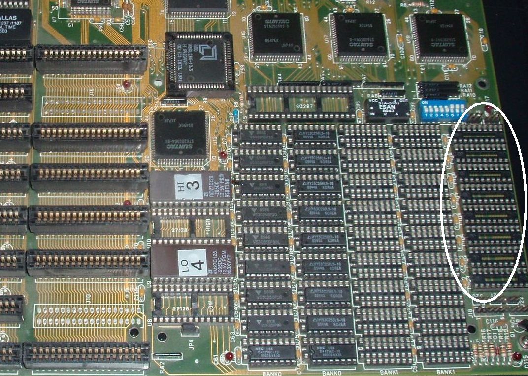Zakroužkovaný blok s paticemi je zřejmě určen pro paritu. Je-li v "hlavních" paticích celkem 512KiB, musí být v paritní sekci osazeno 8x méně (64KiB). Ale je to jen odhad, desku pro 286 jsem už dlouho v ruce nedržel, o dokundamentaci ani nemluvě.