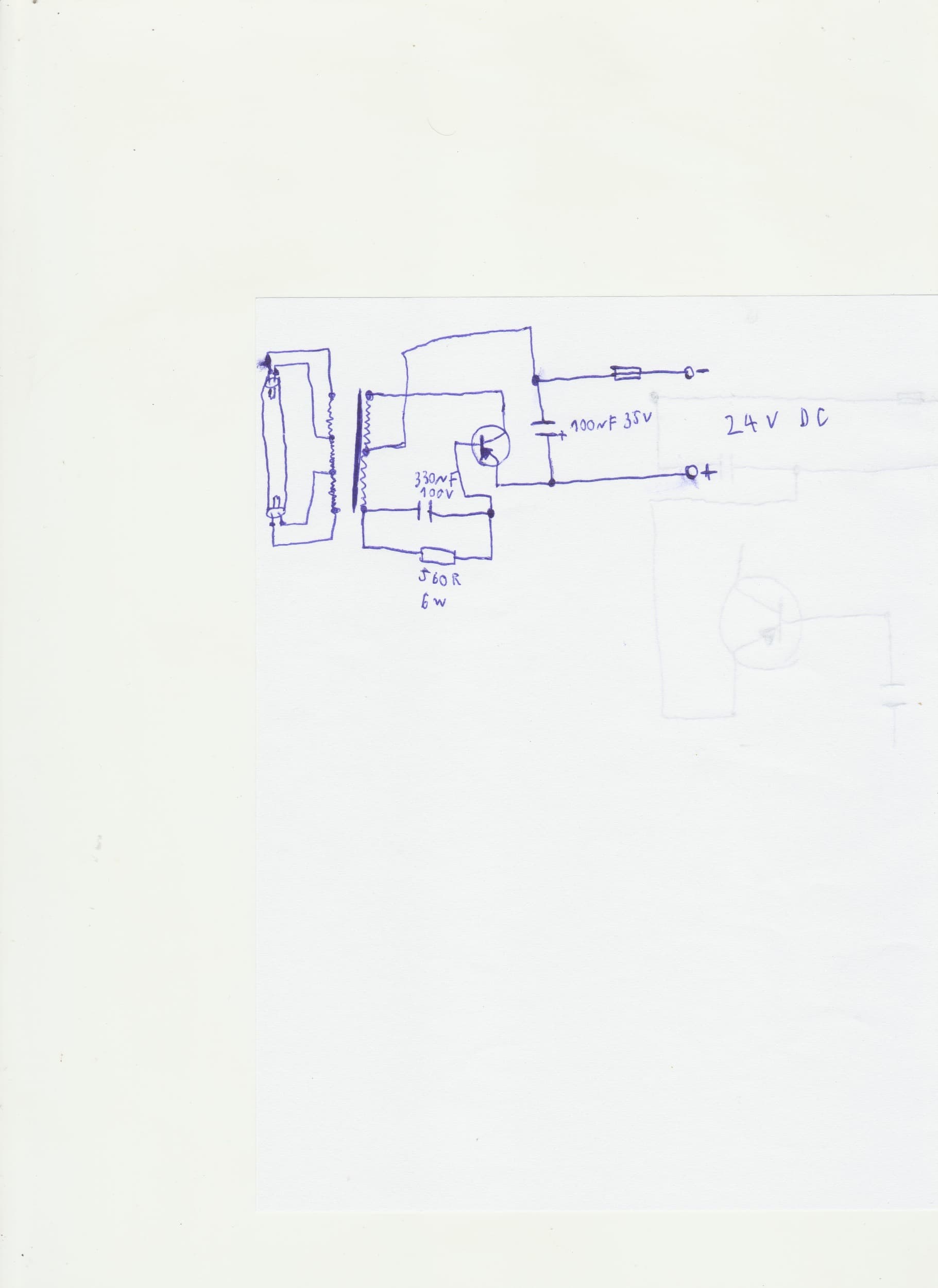 Pokusi jsem se nějak rozkreslit zapojení, omluvte prosím moje kreslící dovednosti a představivost. Zapojení tý trafotlumivky není nakresleno přesně, protože nevím jak to nakreslit protože nevím jak je to zapojeno a jak to tam funguje jsou tam tyto zakladní vstupy které tam jsou zakreslené, a pak je tam ještě jeden vstup přímo z tranzistoru, z kolektoru. Pak je tam ještě jedna nějaká odbočka která je připojena jak si na pouzdro měniče, a pak je na ní připojen kondenzátor a ten vede na jeden z výstupů do zářivky.