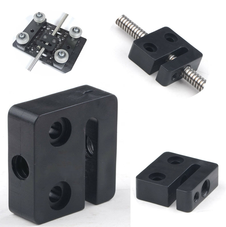 Já si to myslel, však jsem to na konci psal. Nyní tam má trapéz a vymezení rozřízlou trapézovou matku, kterou stahují dva šrouby M3, stejnej princip jako ty černý bloky, co jsi dal poslední obrázek. Jenže ta mašina je dost stará a trapézy jsou v málo používaných krajových polohách "vyšoupaný" mnohem míň, než uprostřed. Výsledkem je, že když se matka stáhne na minimální vůli uprostřed, tak ji na krajích Nema 23 neutáhne. A kuličkáč matka se tam průměrově nevejde, i když šrouby by nebyl problém předělat.