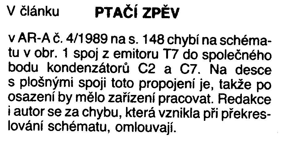 Mám jenom takový malý doplnění k tomu "Ptačímu zpěvu" - posílal jsem ten plánek někomu a zjistitli jsme, že ve schématu v čísle 4/89 je chyba, není nakreslenej propoj mezi emitorem T7 a kladným vývodem C7, na originální uveřejněný desce ale propoj je. Kdyby si někdo kreslil vlastní desku jen podle schématu, nebude mu to pak fungovat právě kvůli tomu chybějícímu propojení.