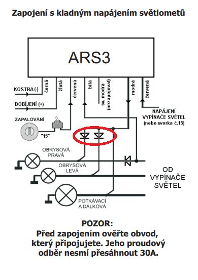 Po zapojení vše funguje, ale celkem topí ty dvě diody v cestě levé a pravé obrysovky viz. obrázek.