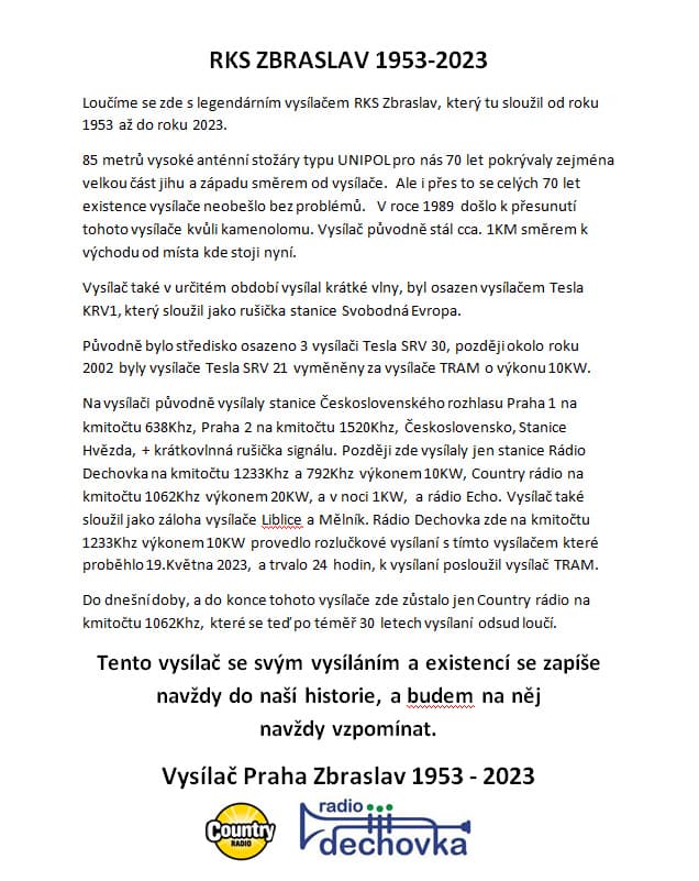 Dnes v 10 hodin dopoledne po 70 letech, navždy utichl středovlný vysílač Praha Zbraslav.