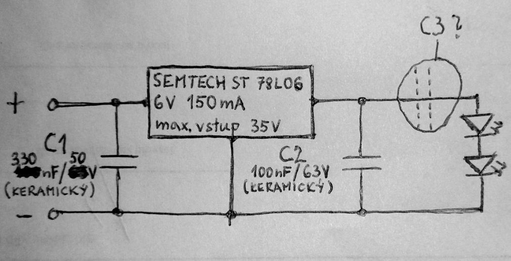 V autě bych si rád zapojil osvětlení kastlíku. Přívod napětí mám vyřešený tak, že jsem napinoval dva vodiče navíc do již stávajícího konektoru jiného kastlíku, použil jsem originální vodiče tak by to mělo být v pořádku. Rád bych použil dvě bílé LED 3V 25mA 5500K v sériovém zapojení. Jelikož v autě kolísá napětí, prodavač v elektru mi pomohl sestavit jednoduchý stabilizátor na 6V - na obrázku.