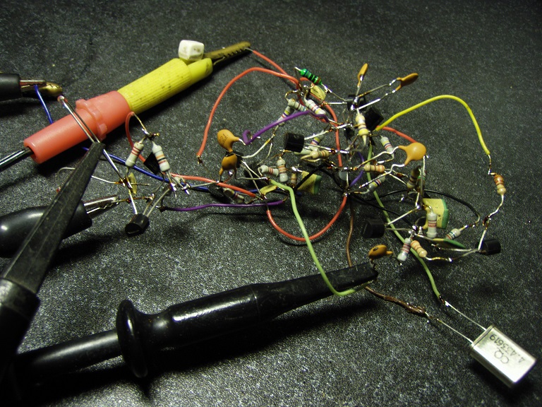 Tato klubíčková realizace je znevýhodněna dlouhými drátky, které podporují nestabilitu vysokofrekvenčních tranzistorů. I proto jsem musel doplnit několik uklidňovacích součástek. Nevhodně připojený osciloskop může vyvolat VHF aktivitu a funkci oscilátoru tak narušit. Lepší je připojení sondy 1/10 přes vhodný rezistor, třeba 1k.