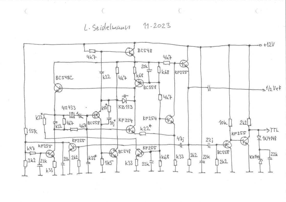 Ve verzi v2 je tranzistorový fázový komparátor, který na rozdíl od původního návrhu reflektuje jemné časování děličky. U vf tranzistorů by byl problém s průrazným napětím Ube, takže spíš něco jako BC548.