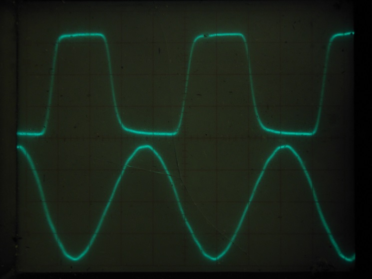 Oscilátor se při své složitosti hodí spíše pro vyšší frekvence, kde by se více projevily parazitní kapacity tranzistorů a třeba i přívodů k rezonátoru do termostatu. Zkusil jsem ho úspěšně upravit na 8 MHz a 12 MHz. Není to obtížné. Naopak 4 MHz už jsou trochu málo s ohledem na kapacitu varikapu a jiné důvody. Ale předkládám zapojení tak, jak jsem jej odladil. Na fotce osciloskopu má horní signál TTL měřítko 1V/dílek a dolní sinusoida 0,5 V/dílek, je trochu zakmitaná vinou současného připojení druhé sondy k výstupu TTL. V odladěném zapojení s použitým krystalem odpovídá napětí na snímacím kondenzátoru k33 velikostí přibližně napětí na ESR, samozřejmě s posuvem ∏/2. Ke kvalitnějšímu krystalu by se hodila větší kapacita snímacího kondenzátoru. Pokud by se oscilátor doplnil o zesilovací stupeň mezi výstupem a zpětnou vazbou k předpětí varikapu, mohla by se amplituda v samotném krystalu stabilizovat na nižší úrovni. To by mohlo být vhodné pro stabilitu frekvence a linearitu obvodů oscilátoru. Výstup by trochu víc šuměl.