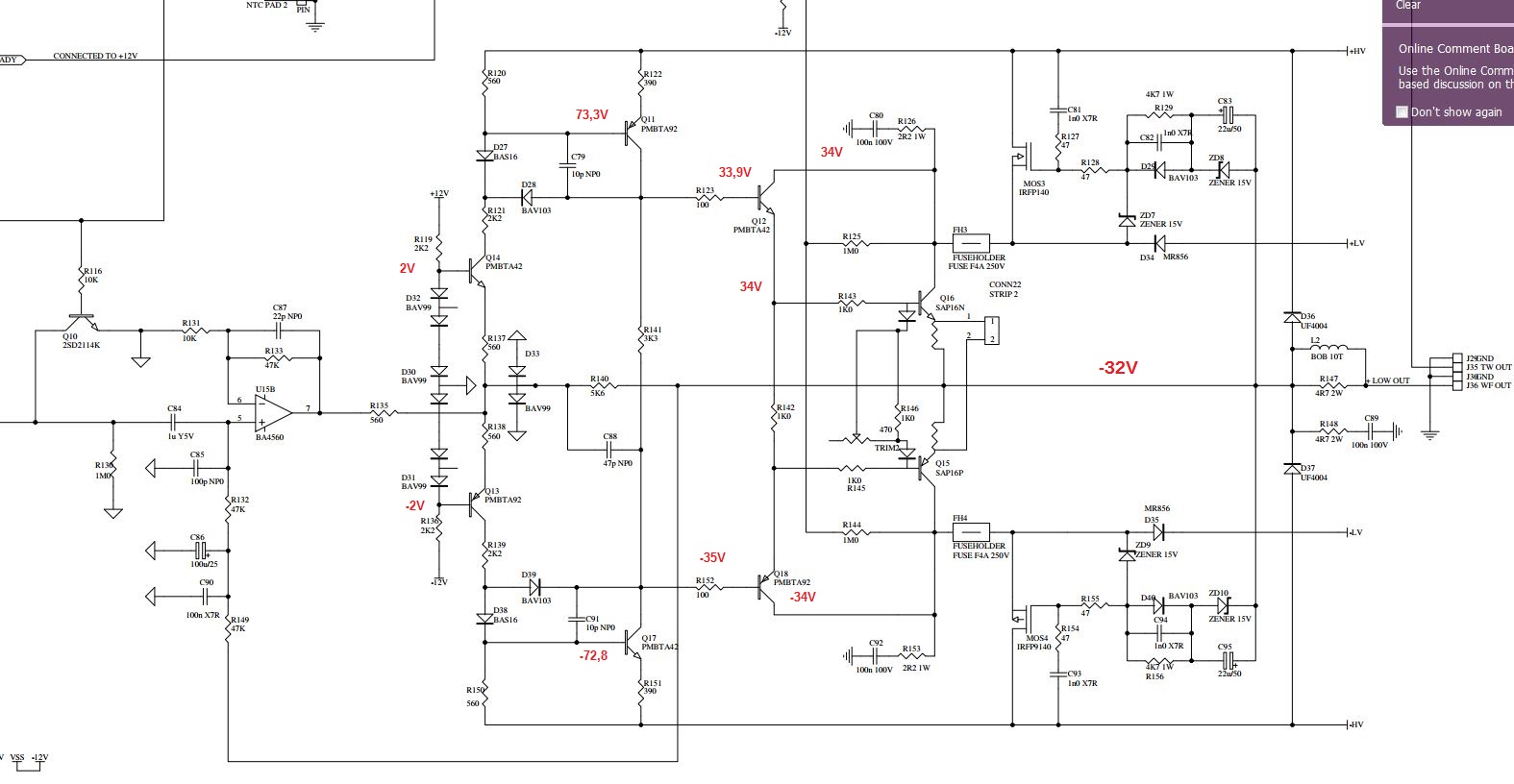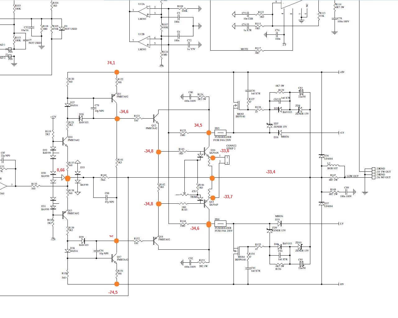 pokud jsou napětí na bázích Q12 +34V a Q18 -34V znamená že by na R141 3k3 muselo téci cca 20mA !!!!