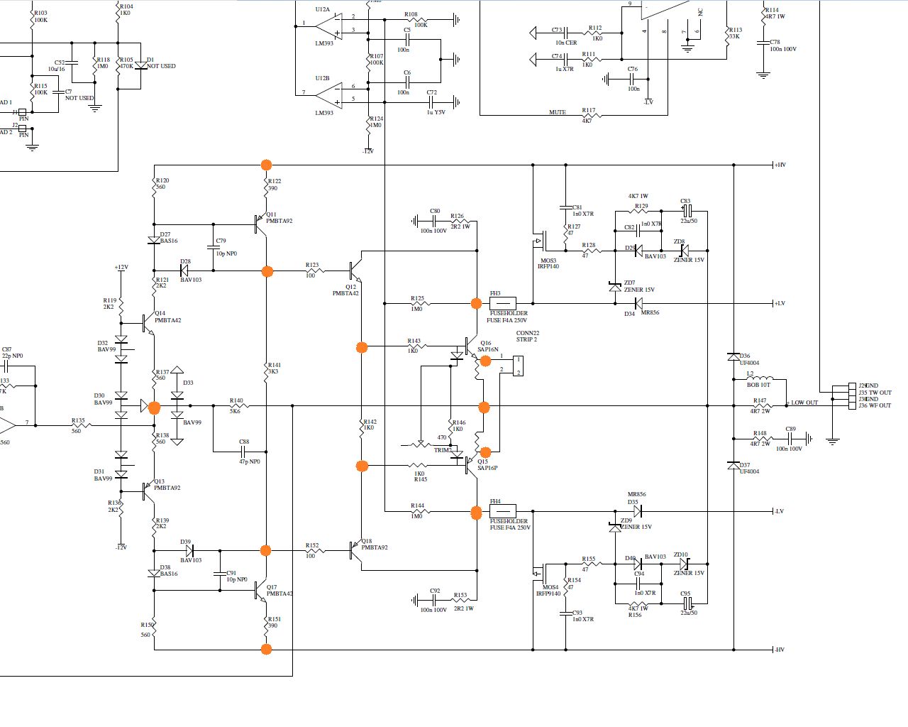 Ahoj mám takové trápení a jsem bez nápadu.Basový zesilovač má na výstupu - větev napájení, tranzistor Q18 je v saturaci přechod BE je téměř -0,7V. Všechny tranzistory proměřeny , projistotu vyměněny , rezistory změřeny vše ok , keramiky prověřeny na svod jsou v pořádku, diody proměřeny na desce dioda testem zdají se být v pořádku. Poradíte mi s inspirací, kde ještě může být zrada. Testuji bez připojeného reproduktoru, nic se nehřeje.