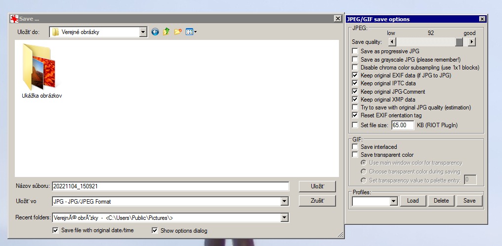 Pri spracovaní obrázku na PC používam IrfanView, kde pri ukladaní je možnosť nastaviť kvalitu obrázku alebo skomprimovanosť, čím sa mení aj veľkosť súboru. Je potrebné mať zaškrnutú voľbu dole v okne "Show options dialog" a posuvníkom sa nastaví úroveň.