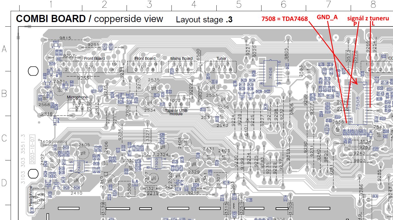 Signál z tuneru pro levý kanál je přiveden na pin 6 a pro pravý kanál na pin 23, a to proti GND_A tj. proti pinu 28 obvodu TDA7468, který je ve schématu označen číslem 7508 viz přiložený obrázek. Ukázka lokalizace na desce viz rovněž přiložený obrázek. Pro přístup k těm pinům obvodu TDA7468 jak se zdá nebude potřeba nějaké extra moc hluboké rozebírání, protože strana spojů na desce Combi board včetně přístupu ke zmíněným pinům by měla být dostupná po odejmutí bočního krytu.