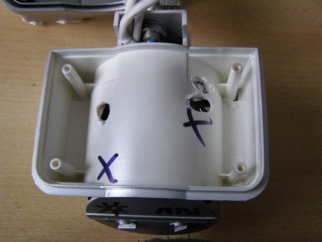 Jde o klasické zapojení zdroje, seriový kondenzátor X2, můstek, zenerka, elektrolyt a relé. Z 30ti světel 4 postupně po 10ti letech svítily trvale. Vadný elektrolyt 330mikrofaradů/35V. Zakoupit předem. Vytrhnout ladítka ve směru osy. Bohužel systém není vyndavací a zas tam dací tak odvrtat díry dle obrázku. Je tam vidět i neplatný pokus. Takto je přístup na poslední dva šroubky krytu PIR. Bohužel šroubky s hlavou PH 1 často prasknou. Přilepil jsem kryt horkým lepidlem. Ladítka jdou vložit zpět. V mém případě jsem ladící tyčky uštípnul a senzor nastavil na „trvalé zapínání bez ohledu den/noc a čas na min“. Tím zabráním místním ladičům v akci. Vše už tady bylo.