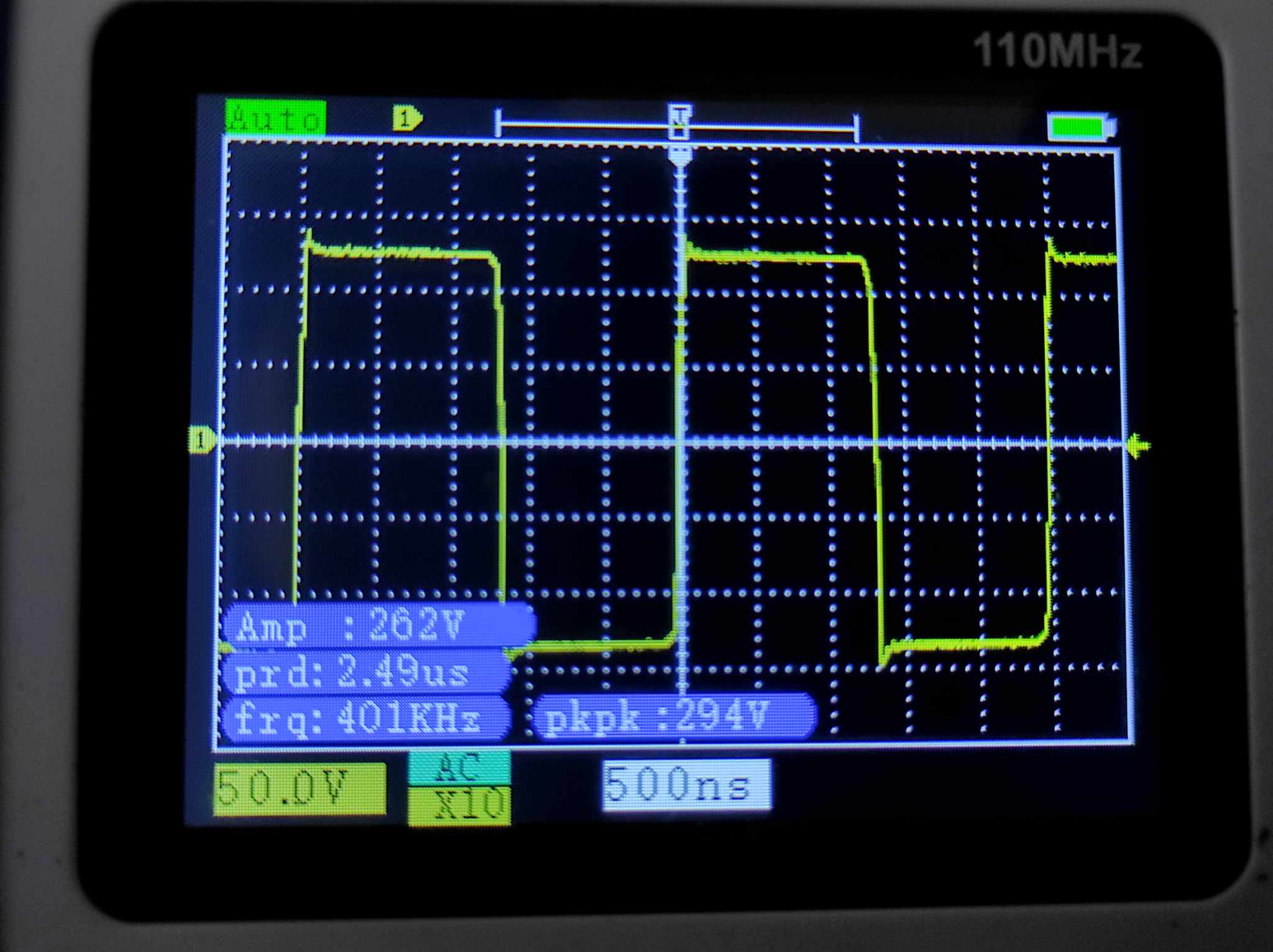 Ćím to, že se neukazuje mrtvý čas, ani když to zatížím žárovkou, když na vstupu je už mrtvý čas 500ns ? A na výstupu se to neprojevuje, něco mě uniká... ( Je to jenom půl mostu, jinak by to bylo 520Vpp 400KHz a cíl je 560Vpp)