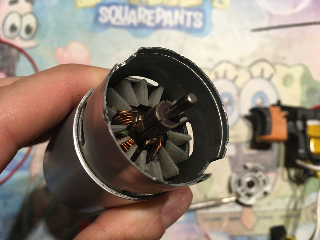 Ještě oživuju toto téma, dostal se mě do ruky další kus, tentokrát novější model ASV 14EA který už má Li-ion baterii a k tomu dva kusy ještě zachovalých aku (80%). Motor ale hoří a smrdí, rozborka ukázala, že uvnitř motoru je vrstva špíny a mastnoty, komutátor celý zalepený.
