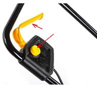 Funguje to tak, že se jednou rukou stiskne a drží ten žlutý čudllík a současně druhou rukou se přitáhne a drží ta žlutá páka (v odkazu je černá), tím se rozeběhne sekačka, ten žlutý čudlík se pak může pustit a sekačka seká dokud se ta žlutá páka drží. Zřejmě to je kvůli bezpečnosti, když se ta žlutá páka pustí, tak se sekačka vypne.