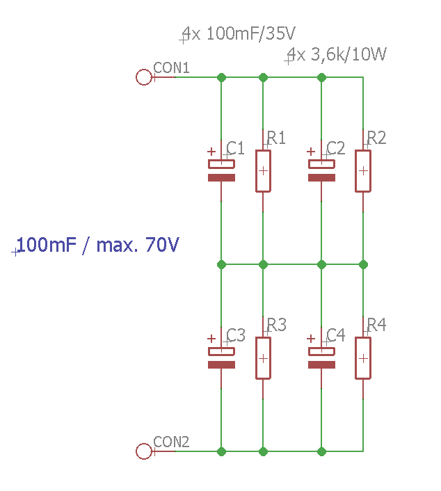 Dotaz byl jestli budou ty vybíjecí odpory stačit na naprosto spolehlivý udržení polovičního napětí na obou sériových elytech. Pokud by se jeden z odporů přerušil, asi by to určitě skončilo dost silným výbuchem. Věřit tomu a nebo to nějak posichrovat? A taky co to bude dělat při přechodovým jevu při zapnutí?