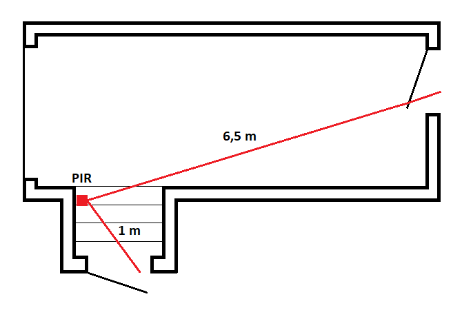 Problém toho umístění dle náčrtku je jinde, ne ve vzdálenosti 6.5m. Problém je v tom, že PIR reaguje na pohybující se objekt napžíč před čidlem, zatímco na pohyb objektu přímo proti PIR, přibližující se anebo vzdalující se objekt proti PIR, moc nereagují. To mám vyzkoušeno mnohokrát. Je to také v návodech na příbalových letáčcích. PIR čidlo je potřeba umístit tak, aby pohybující se objekt byl vůči PIR čidlu ze strany a pohyboval se napříč před čidlem. Tedy umístit čidlo na stěnu mezi dveře. Jestliže tam nelze sekat nutno natahnout vedení v liště po povrchu.
