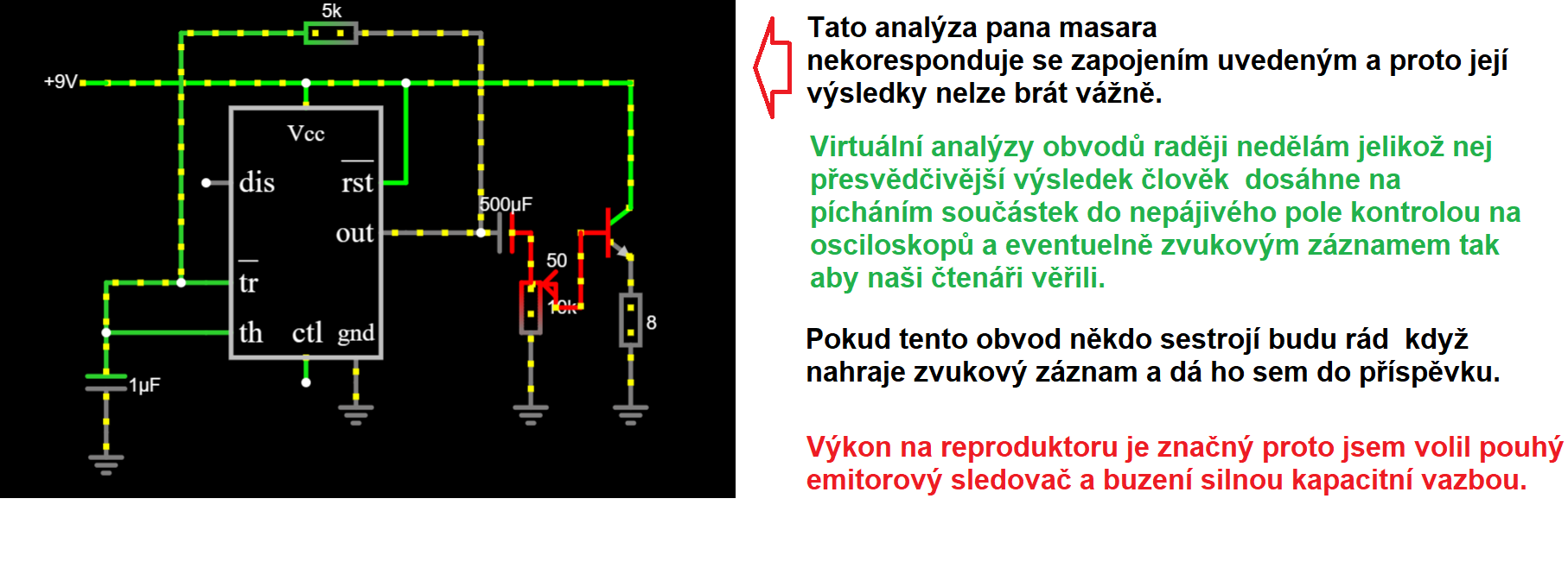Vzhledem k tomu, že NE555 má komplementární symetrickej výstup, nemá cenu oddělovat ho od báze dalšího trandu kapacitou, stačí jen odpor. Ten šváb stejnosměrnej proud až do hodnoty daný datasheetem snese, báze tranzistoru taky. Nemusí ho vydržet zátěž v kolektoru toho trandu, ale stejně je obecně lepší, pokud je potřeba zvyšovat výstupní výkon za 555kou, použít další komplementární dvojici a stejnosměrný oddělení zátěže udělat až za tou dvojicí - stejně jako u běžnejch nf zešilovačů s jedním napájecím napětím. _________________ Nasliněný prst na svorkovnici domovního rozvaděče: Jó, paninko, máte tam ty Voltíky všecky...