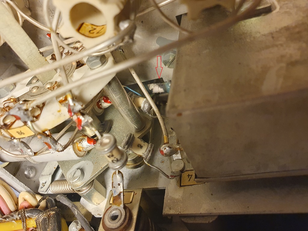 Další měření proběhlo přes umělou anténu která se skládá z odporů a žárovky, která nesvítila (žárovka je OK). Z těchto důvodů jsem zesilovač otevřel a uviděl spálený kondenzátor. Taktéž jsem zjistil, že se v zesilovači v minulosti někdo hrabal podle nehezkého pájení na konektoru u tranzistorového měniče a studenňáku na tom samém konektoru (jeden vodič samovolně upadnul z pájení na jazýčku konektoru)