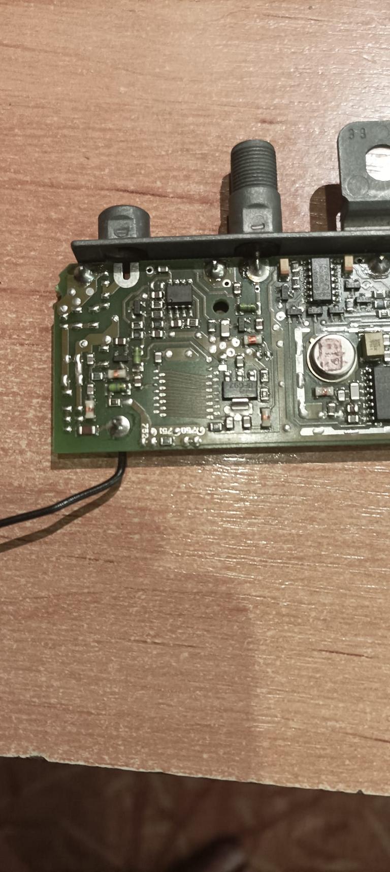 Zesilovač FM, připojen na vyhřívání, zadní sklo. Germáni chtěli zas mít něco dokonale a splácali tohle. Ve výsledku rádio moc nefunguje. Výpadky signálu za jízdy, hlavně svislá polarizace. Je to levá část, přívod drátek, vývod koax. Dva SMD tranzitory, pak ten větší BFG97, 20V, 0,1A na co? A IO STA 2904 nebo STA 714, nic nenalezeno. Výrobce FUBA, 1998. Na co jsou ty vlasové propoje? Jsou i na druhé straně dps. Ty součástky na tu dobu asi OK. Nebylo by jednodušší vrazit tam normální nový zesilovač? Jiný se chová stejně blbě..