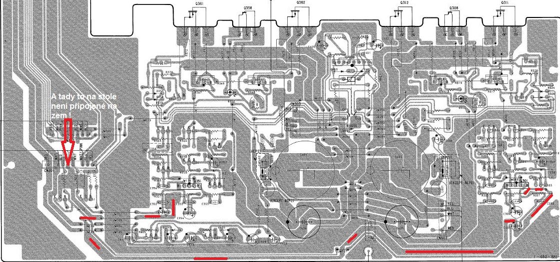 Dostal jsem na opravu zesilovač, jeden konec prostřelený skrnaskrz. Potíže s tranzistory jsem popsal jinde, koupil jsem náhodou na aukru jeden stejný zesik s tím, že v něm aspoň jeden pár tranzistorů bude živý. Vyndány obě hlavní desky a připojeny na stabilizovaný zdroj ± 36V s omezením proudu. Odběry tak nějak míň než jsem čekal, cvaknutí relé připojující repro se neozvalo. Na desce s mrtvým koncem (mrtvé tranzistory vypájeny) na živém offset cca 4V. Stejná zkouška s druhou deskou konců ukázala offset u obou konců 35V, už to je divné a trochu mě postrčilo, že závada je pro oba konce společná a stejná. Změřil jsem všechna napájecí napětí, O.K., pak měřil na tranzistorech, stále bez nějakého valného výsledku, jen při změně napětí (ze cca 30 na 36V) na konci s vadnými tranzistory relé repro na chvíli cvaklo. V tu chvíli mě napadlo, (už jsem to zjistil i jindy na jiném zesilovači), že by mohla někde chybět země. Prozkoumal jsem schema a desku plošného spoje a bylo jasno, viz obrázky. Teď mám jeden živý zesilovač a další stále s jedním vadným koncem a problémem kde koupit tranzistory (něco budu mít od DENKLa tak se uvidí)....