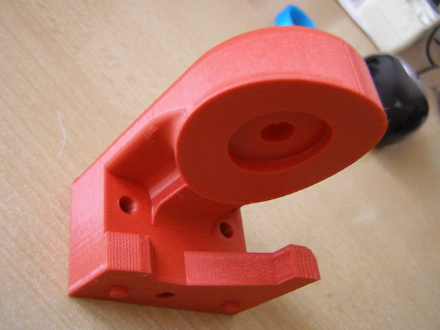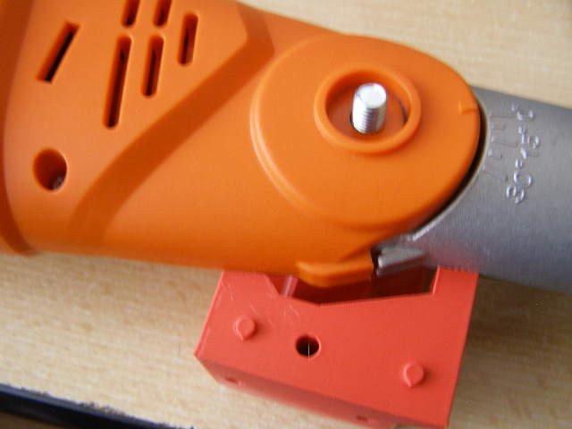 Je to taková pilka kterou lze trochu dále dosáhnout, už vrčí. Vložka byla elipsa tak se s tím program popasoval. Sedlo to na první dobrou. Těžiště je někde na komutátoru motoru v místě asi 6cm od toho černého knoflíku kam vychází druhý držák tak, že to mírně padá na řetěz. Na obrázku je první nástřel držáku. Dosedací plocha držáku je průnik elipsy válcem, pak zrcadlení na pomocné ploše pro druhou stranu a to celé půlené se zámkem proti otočení. Docela mě to trénuje. Zatím to ale vypadá řešitelné. Pila už teď je použitelná.