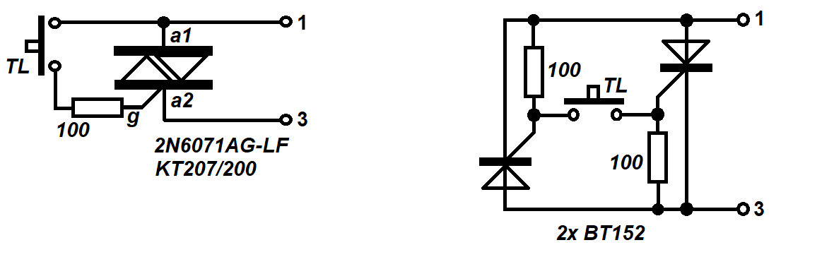 Ale je to jen nápad, s triakem to vyzkoušené nemám, jen to se dvěma opačně pólovanými tyristory, každý má mezi svou katodou a gate odpor 100 Ω a mezi těmi řídicími elektrodami zapojený spínací kontakt. Naprosto spolehlivě nám 15 let sloužilo v okruhu 12 VAC k proudovému posílení výstupu časového spínače.