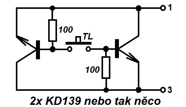 Tak teď už skutečně teoretizuju, ale s tranzistory by to mohlo jít taky: i kdyby se na bázi kteréhokoli tranzistoru dostalo stiskem tlačítka záporné napětí proti jeho emitoru, druhý tranzistor otevře a zmenší to napětí na obvodu pod 1,5 V, takže hodnota neškodná. A v následující půlvlně se totéž povede druhému tranzistoru.