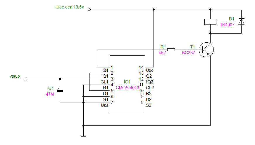 Upravil jsem hodnoty v předřazeném obvodu takže teď mám na vstupu 4013 při impulsu pro překlopení cca 12V ale stejně to nefunguje. někdy to přepne nahodile mi přijde (keramiku 100n na napájení IO jsem zkusil dát také a ten elyt u vstupu jsem zkušebně odpojil)