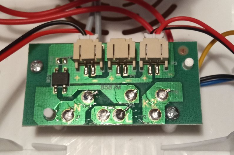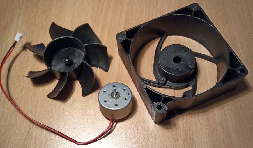 Zo špirály je odbočka v jednej dvadsiatine. Medzi odbočkou a nulákom je usmerňovač a na ňom motorček a dve UV LED. Všetko paralelne. Na motorčeku som nameral digitálnym multimetrom 6,4V DC (?). Motorček je RF-300EH-1D390. Ventilátor je 70x70x25mm.