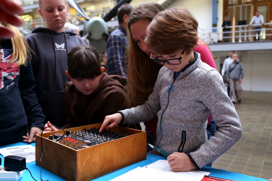 Děti si ovládání (šest posuvníků na obrazovce) v chumlu okoukají od předchozích a ozkouší. Výklad měli na morseovce a dalších stanovištích.
