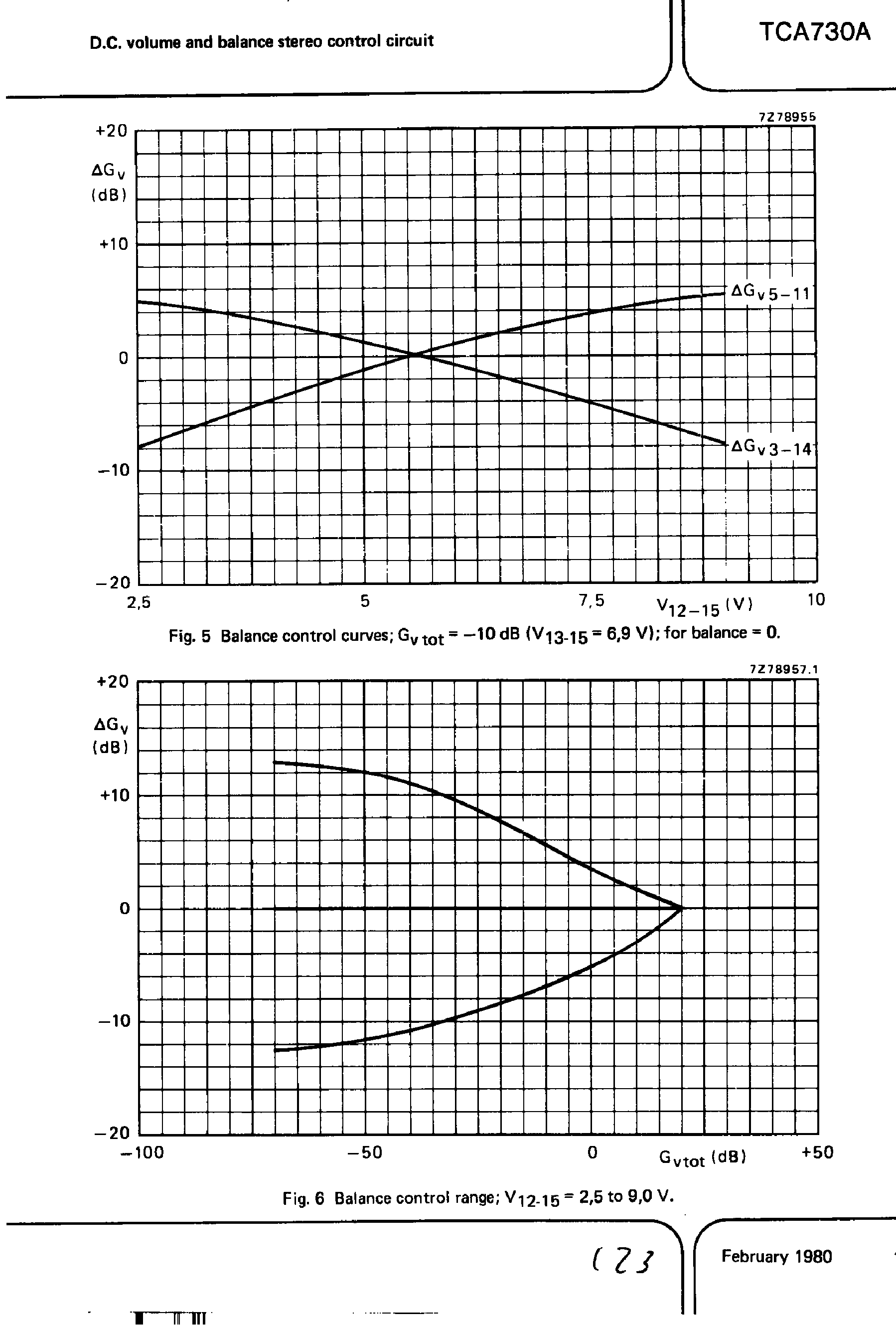 Keď správne rozumiem schéme, tak výstupy 9 a 16 sú už po aplikovaní balance. Tam by mala byť úroveň zvukového signálu už ovplyvnená polohou potenciometru Balance. Pokiaľ je tento v krajnej polohe, jeden zo signálov by mal byť utlmený na nulu. Zameral by som sa na vstup 12. Keď Us je +15V, tak pri odporoch 1,5k a 5k (10k/2) by tam malo byť v krajnej polohe 11,5V alebo 0V (podľa toho ktorý kraj), pokiaľ to vstup 12 neťahá dolu.