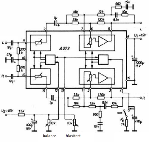 Začni měřit: na pinu 12 A273 musí být těsně kolem 6 V, pak mají oba kanály stejný zisk. Jestli tam těch 6 V je, pak buď chybí úroveň už na vstupu (pin 11 nebo 14), nebo jsou tam ještě úrovně stejné, v tom případě bych šel po elektrolytech na pinech 9 nebo 16.