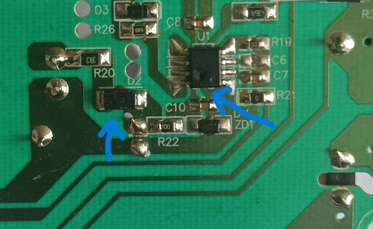 Mám problém s vakuovačkou SILVERCREST SV125 B2 prinesli mi ji na opravu po rozebrání zjištěna vadná dioda což není problém ovšem bouchl čip ze kterého nejde číst označení viz foto, proto prosím o radu jestli někdo nemá schema nebo zkušenost či jiný nápad jak zjistit označení.